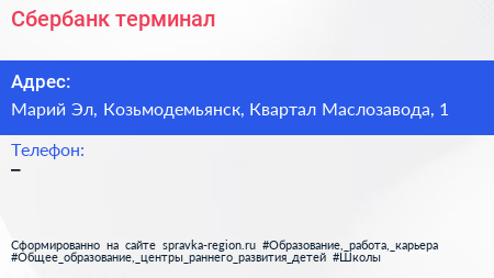 Сбербанк, терминал по адресу Марий Эл, Козьмодемьянск, Квартал Маслозавода, 1 в дальнейшем Организация, размещена в следующих категориях:
