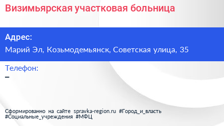 Визимьярская участковая больница по адресу Марий Эл, Козьмодемьянск, Советская улица, 35 в дальнейшем Организация, размещена в следующих категориях: