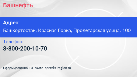 Башнефть по адресу Башкортостан, Красная Горка, Пролетарская улица, 100 в дальнейшем Организация, размещена в следующих категориях: