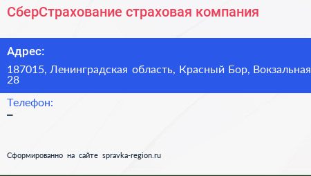 СберСтрахование, страховая компания по адресу 187015, Ленинградская область, Красный Бор, Вокзальная, 28 в дальнейшем Организация, размещена в следующих категориях: