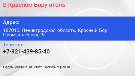 В Красном Бору, отель по адресу 187015, Ленинградская область, Красный Бор, Промышленная, 3в в дальнейшем Организация, размещена в следующих категориях: