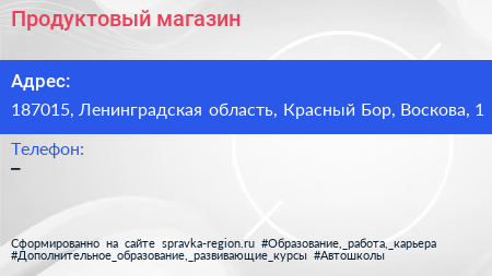 Продуктовый магазин по адресу 187015, Ленинградская область, Красный Бор, Воскова, 1 в дальнейшем Организация, размещена в следующих категориях: