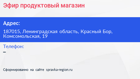 Эфир, продуктовый магазин по адресу 187015, Ленинградская область, Красный Бор, Комсомольская, 19 в дальнейшем Организация, размещена в следующих категориях: