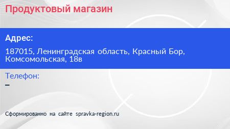 Продуктовый магазин по адресу 187015, Ленинградская область, Красный Бор, Комсомольская, 18в в дальнейшем Организация, размещена в следующих категориях: