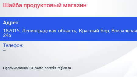 Шайба, продуктовый магазин по адресу 187015, Ленинградская область, Красный Бор, Вокзальная, 24а в дальнейшем Организация, размещена в следующих категориях: