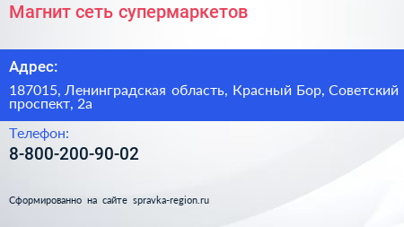 Магнит, сеть супермаркетов по адресу 187015, Ленинградская область, Красный Бор, Советский проспект, 2а в дальнейшем Организация, размещена в следующих категориях: