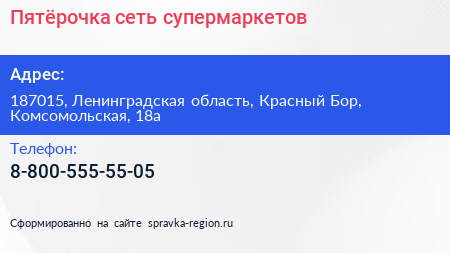 Пятёрочка, сеть супермаркетов по адресу 187015, Ленинградская область, Красный Бор, Комсомольская, 18а в дальнейшем Организация, размещена в следующих категориях: