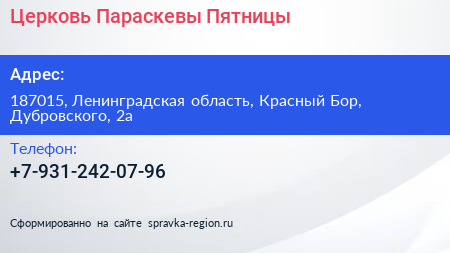 Церковь Параскевы Пятницы по адресу 187015, Ленинградская область, Красный Бор, Дубровского, 2а в дальнейшем Организация, размещена в следующих категориях: