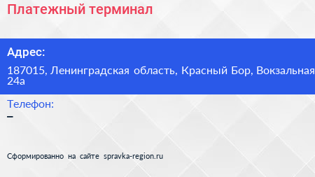 Платежный терминал по адресу 187015, Ленинградская область, Красный Бор, Вокзальная, 24а в дальнейшем Организация, размещена в следующих категориях: