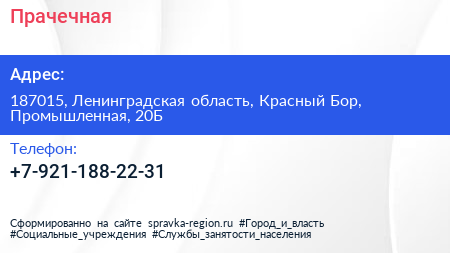 Прачечная по адресу 187015, Ленинградская область, Красный Бор, Промышленная, 20Б в дальнейшем Организация, размещена в следующих категориях: