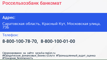 Россельхозбанк, банкомат по адресу Саратовская область, Красный Кут, Московская улица, 73Б в дальнейшем Организация, размещена в следующих категориях: