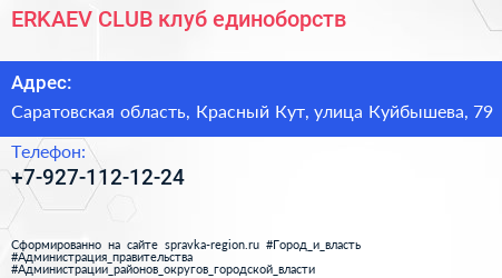 ERKAEV CLUB, клуб единоборств по адресу Саратовская область, Красный Кут, улица Куйбышева, 79 в дальнейшем Организация, размещена в следующих категориях: