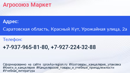 Агросоюз-Маркет по адресу Саратовская область, Красный Кут, Урожайная улица, 2а в дальнейшем Организация, размещена в следующих категориях: