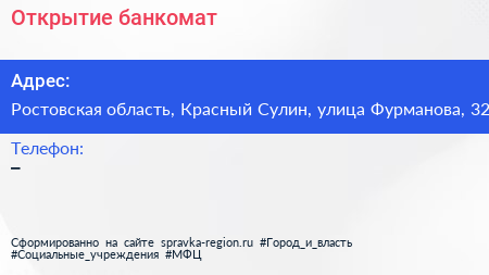 Открытие, банкомат по адресу Ростовская область, Красный Сулин, улица Фурманова, 32 в дальнейшем Организация, размещена в следующих категориях: