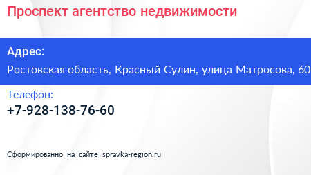 Проспект, агентство недвижимости по адресу Ростовская область, Красный Сулин, улица Матросова, 60 в дальнейшем Организация, размещена в следующих категориях:
