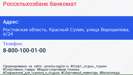 Россельхозбанк, банкомат по адресу Ростовская область, Красный Сулин, улица Ворошилова, 6/24 в дальнейшем Организация, размещена в следующих категориях: