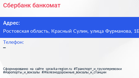 Сбербанк, банкомат по адресу Ростовская область, Красный Сулин, улица Фурманова, 1Б в дальнейшем Организация, размещена в следующих категориях: