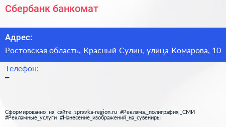 Сбербанк, банкомат по адресу Ростовская область, Красный Сулин, улица Комарова, 10 в дальнейшем Организация, размещена в следующих категориях: