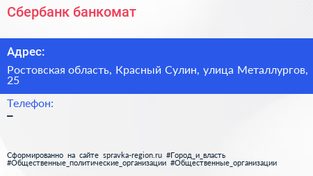 Сбербанк, банкомат по адресу Ростовская область, Красный Сулин, улица Металлургов, 25 в дальнейшем Организация, размещена в следующих категориях: