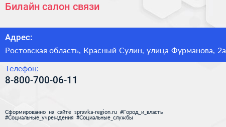 Билайн, салон связи по адресу Ростовская область, Красный Сулин, улица Фурманова, 2а в дальнейшем Организация, размещена в следующих категориях: