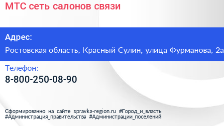 МТС, сеть салонов связи по адресу Ростовская область, Красный Сулин, улица Фурманова, 2а в дальнейшем Организация, размещена в следующих категориях: