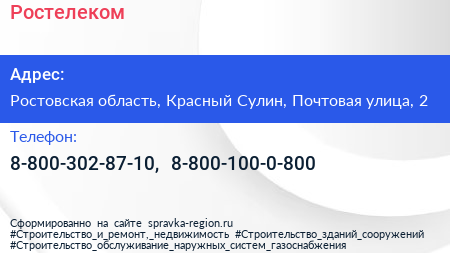 Ростелеком по адресу Ростовская область, Красный Сулин, Почтовая улица, 2 в дальнейшем Организация, размещена в следующих категориях: