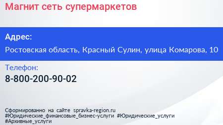 Магнит, сеть супермаркетов по адресу Ростовская область, Красный Сулин, улица Комарова, 10 в дальнейшем Организация, размещена в следующих категориях: