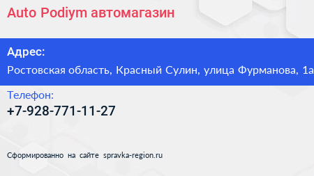 Auto-Podiym, автомагазин по адресу Ростовская область, Красный Сулин, улица Фурманова, 1а в дальнейшем Организация, размещена в следующих категориях: