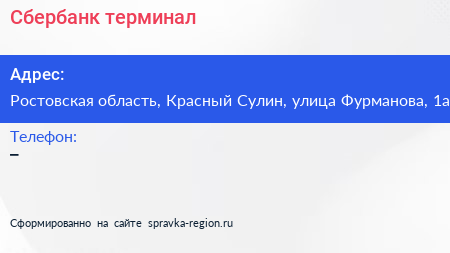 Сбербанк, терминал по адресу Ростовская область, Красный Сулин, улица Фурманова, 1а в дальнейшем Организация, размещена в следующих категориях: