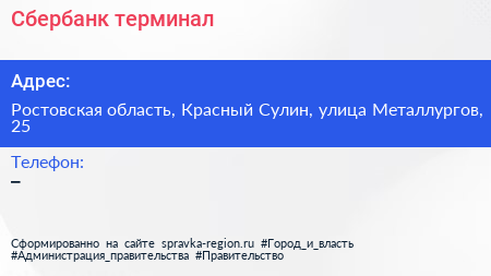 Сбербанк, терминал по адресу Ростовская область, Красный Сулин, улица Металлургов, 25 в дальнейшем Организация, размещена в следующих категориях:
