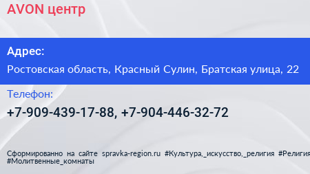 AVON, центр по адресу Ростовская область, Красный Сулин, Братская улица, 22 в дальнейшем Организация, размещена в следующих категориях: