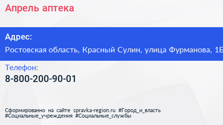 Апрель, аптека по адресу Ростовская область, Красный Сулин, улица Фурманова, 1Б в дальнейшем Организация, размещена в следующих категориях: