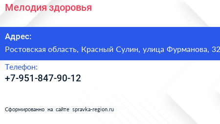 Мелодия здоровья по адресу Ростовская область, Красный Сулин, улица Фурманова, 32 в дальнейшем Организация, размещена в следующих категориях: