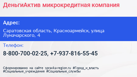 ДеньгиАктив, микрокредитная компания по адресу Саратовская область, Красноармейск, улица Луначарского, 4 в дальнейшем Организация, размещена в следующих категориях: