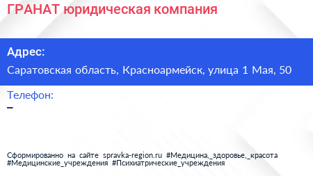 ГРАНАТ, юридическая компания по адресу Саратовская область, Красноармейск, улица 1 Мая, 50 в дальнейшем Организация, размещена в следующих категориях: