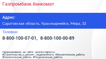 Газпромбанк, банкомат по адресу Саратовская область, Красноармейск, Мира, 32 в дальнейшем Организация, размещена в следующих категориях: