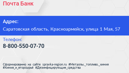 Почта Банк по адресу Саратовская область, Красноармейск, улица 1 Мая, 57 в дальнейшем Организация, размещена в следующих категориях: