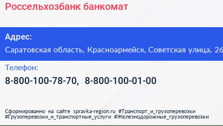 Россельхозбанк, банкомат по адресу Саратовская область, Красноармейск, Советская улица, 26 в дальнейшем Организация, размещена в следующих категориях: