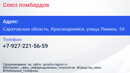 Союз ломбардов по адресу Саратовская область, Красноармейск, улица Ленина, 54 в дальнейшем Организация, размещена в следующих категориях: