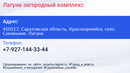 Лагуна, загородный комплекс по адресу 410517, Саратовская область, Красноармейск, село Синенькие, Лагуна в дальнейшем Организация, размещена в следующих категориях: