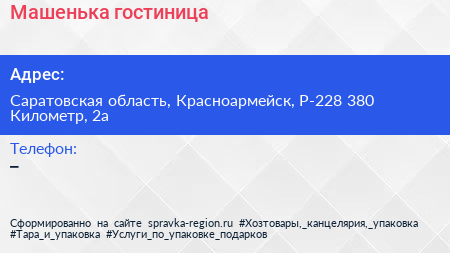 Машенька, гостиница по адресу Саратовская область, Красноармейск, Р-228 380 Километр, 2а в дальнейшем Организация, размещена в следующих категориях: