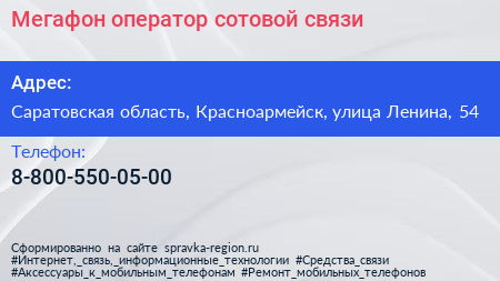 Мегафон, оператор сотовой связи по адресу Саратовская область, Красноармейск, улица Ленина, 54 в дальнейшем Организация, размещена в следующих категориях:
