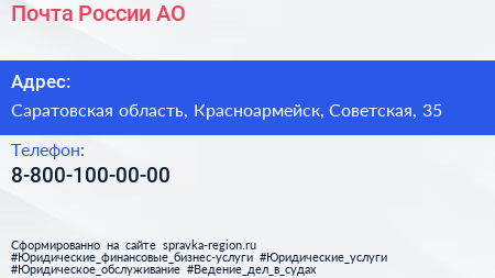 Почта России, АО по адресу Саратовская область, Красноармейск, Советская, 35 в дальнейшем Организация, размещена в следующих категориях: