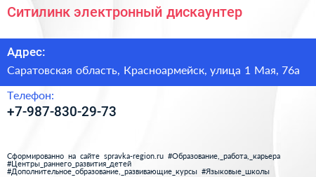 Ситилинк, электронный дискаунтер по адресу Саратовская область, Красноармейск, улица 1 Мая, 76а в дальнейшем Организация, размещена в следующих категориях: