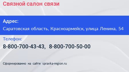 Связной, салон связи по адресу Саратовская область, Красноармейск, улица Ленина, 54 в дальнейшем Организация, размещена в следующих категориях: