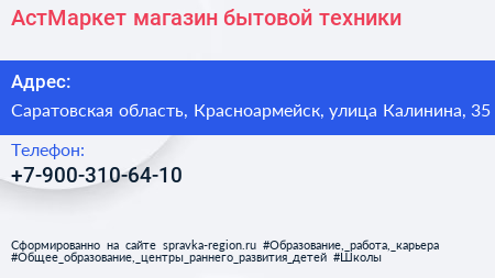 АстМаркет, магазин бытовой техники по адресу Саратовская область, Красноармейск, улица Калинина, 35 в дальнейшем Организация, размещена в следующих категориях: