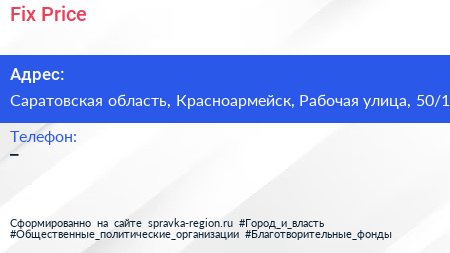 Fix Price по адресу Саратовская область, Красноармейск, Рабочая улица, 50/1 в дальнейшем Организация, размещена в следующих категориях: