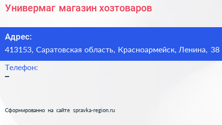 Универмаг, магазин хозтоваров по адресу 413153, Саратовская область, Красноармейск, Ленина, 38 в дальнейшем Организация, размещена в следующих категориях:
