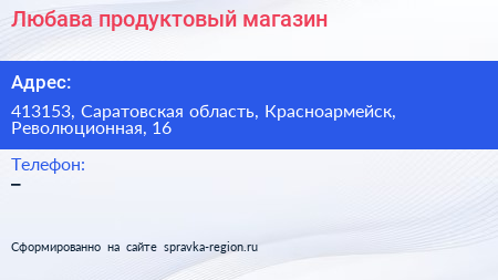 Любава, продуктовый магазин по адресу 413153, Саратовская область, Красноармейск, Революционная, 16 в дальнейшем Организация, размещена в следующих категориях: