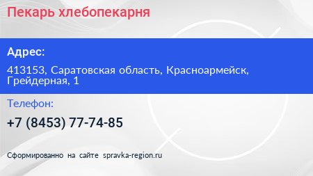 Пекарь, хлебопекарня по адресу 413153, Саратовская область, Красноармейск, Грейдерная, 1 в дальнейшем Организация, размещена в следующих категориях: